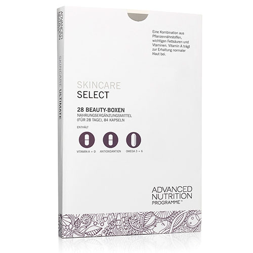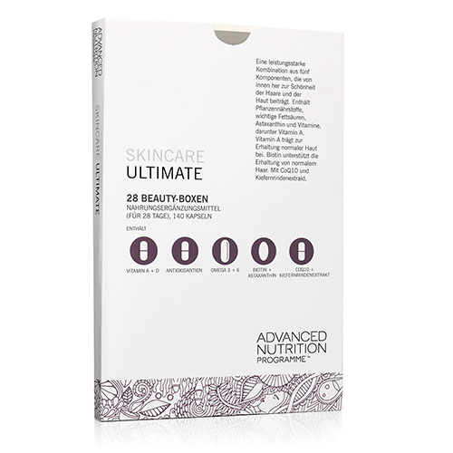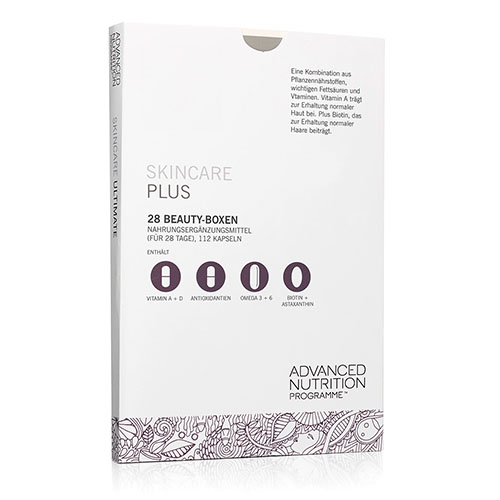 In diesem Produkt sind die Advanced Nutrition Programme Nahrungsergänzungsprodukte Skin Antioxidant, Skin Vitamin A+ und Skin Omegas+ für eine gesunde Haut sind in 28 Beauty Boxen enthalten, wobei die Anwendungsempfehlung bei der Einnahme des Inhalts einer Beauty Box täglich liegt.